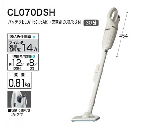 マキタ 掃除機<CL070DSH> 充電式クリーナー 7.2V 1.5Ah アイボリー バッテリー 充電器付 セット品