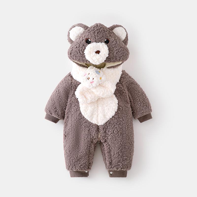 ロンパース ベビー 子供 男女兼用 秋冬 ボア フリース 裏起毛 中綿入り 厚手 長袖 フード付き ジッパー 外出 お出かけ 防寒 カバーオール マフラーデザイン